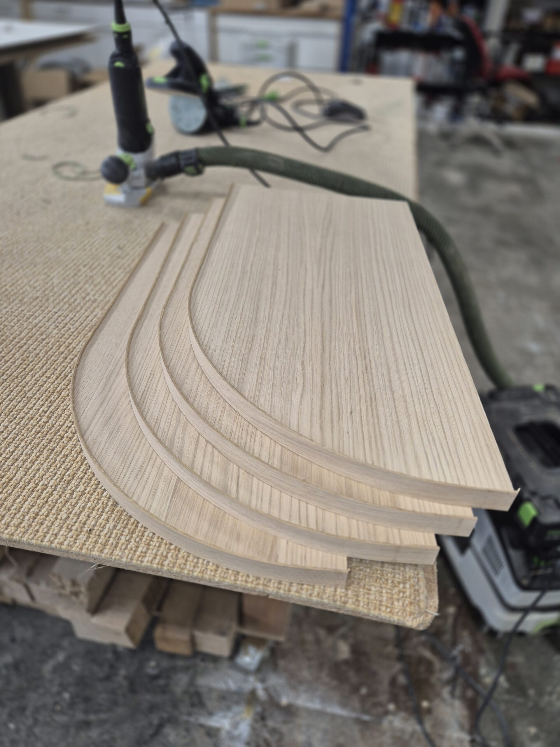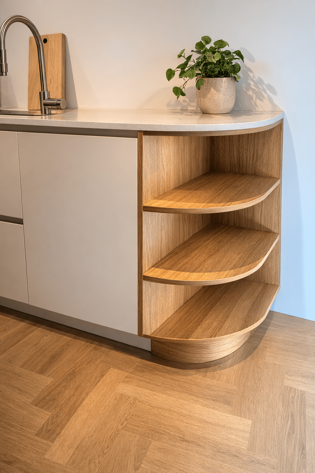Voor deze maatwerk keuken is een afgeronde hoekkast gemaakt met planken uitgevoerd in eiken fineer. De elegante ronding sluit perfect aan bij het ontwerp van de keuken. Het eiken is afgewerkt met Monocoat olie, waardoor de natuurlijke houtstructuur mooi naar voren komt en het oppervlak duurzaam beschermd is.